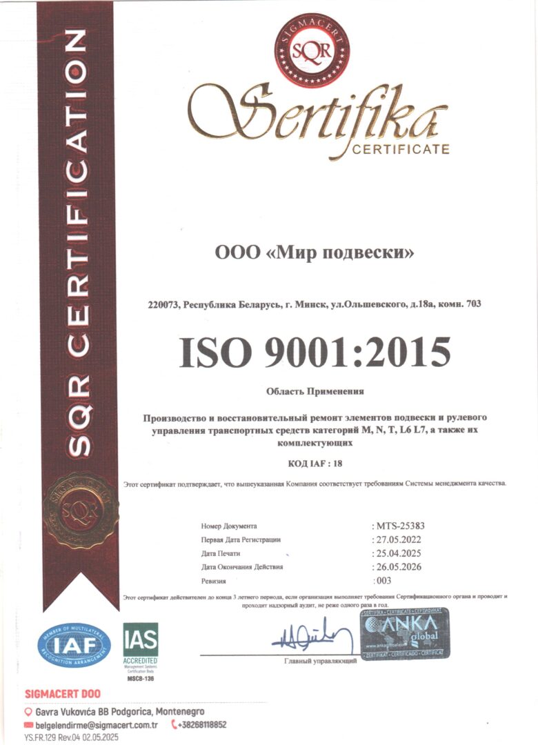 Сервисный центр «Мир подвески» единственный в Республике Беларусь получил сертификат соответствия на услуги по восстановлению шаровых шарниров элементов подвески и рулевого управления. При сертификации были проведены испытания восстановленных нами шаровых шарниров. По результатам испытаний экспертная комиссия заключила, что изготавливаемые нами образцы соответствуют требованиям, предъявляемым к новым шаровым шарнирам.